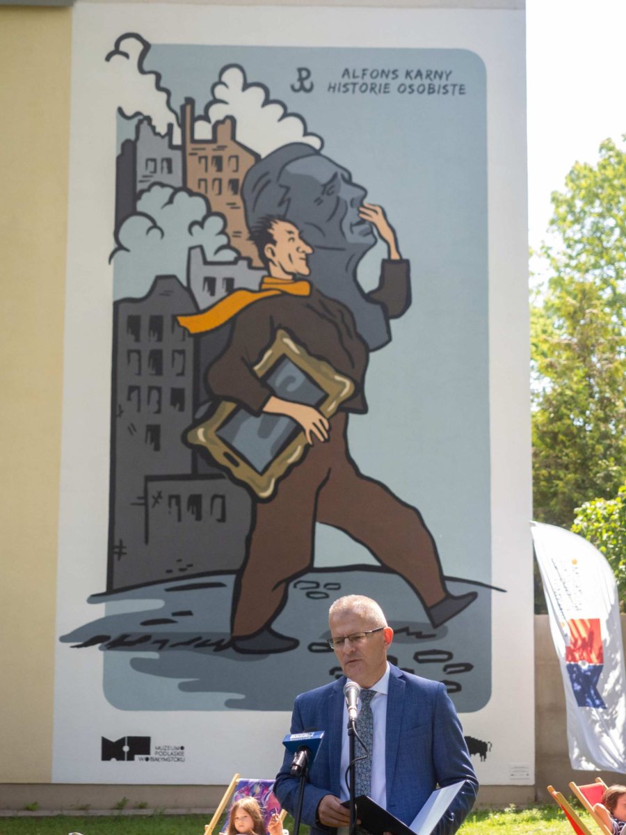 – Mural ma być taką trwałą wartością po otwarciu wystawy, takim działaniem, które zostanie tutaj w przestrzeni muzealnej, w ogrodzie muzeum, ma upamiętniać tę wystawę i o niej przypominać. Mural jest zaprojektowały w duchu Alfonsa Karnego. On był bardzo dowcipnym człowiekiem, z dużym poczuciem humoru. W związku z tym cały projekt muralu powstał na bazie karykatury Alfonsa Karnego. Przedstawiam Alfonsa Karnego, który ratuje dzieła sztuki, wynosi je z płonącej Warszawy, niesie rzeźba Solskiego i jeszcze obraz. Brał udział w akcji pruszkowskiej ratowania dzieł sztuki i to jest też odniesienia do tych właśnie wydarzeń – mówi dr Krystyna Stawecka, zastępca dyrektora ds. merytorycznych Muzeum Alfonsa Karnego.