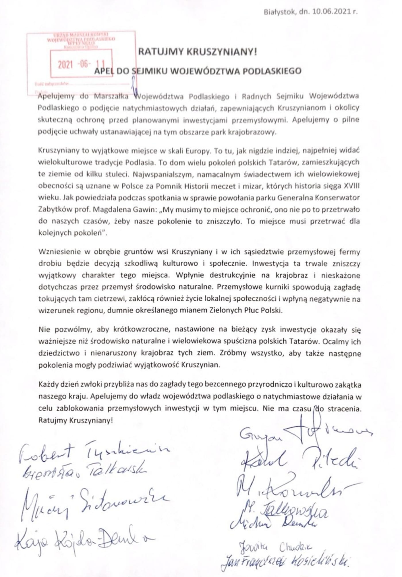 Kruszyniany to wyjątkowe miejsce w skali Europy. To tu, jak nigdzie indziej, najpełniej widać wielokulturowe tradycje Podlasia. To dom wielu pokoleń polskich Tatarów, zamieszkujących te ziemie od kilku stuleci, a namacalnym świadectwem ich wielowiekowej obecności są uznane w Polsce za Pomnik Historii meczet i mizar, których historia sięga XVIII wieku – przekonują autorzy petycji.