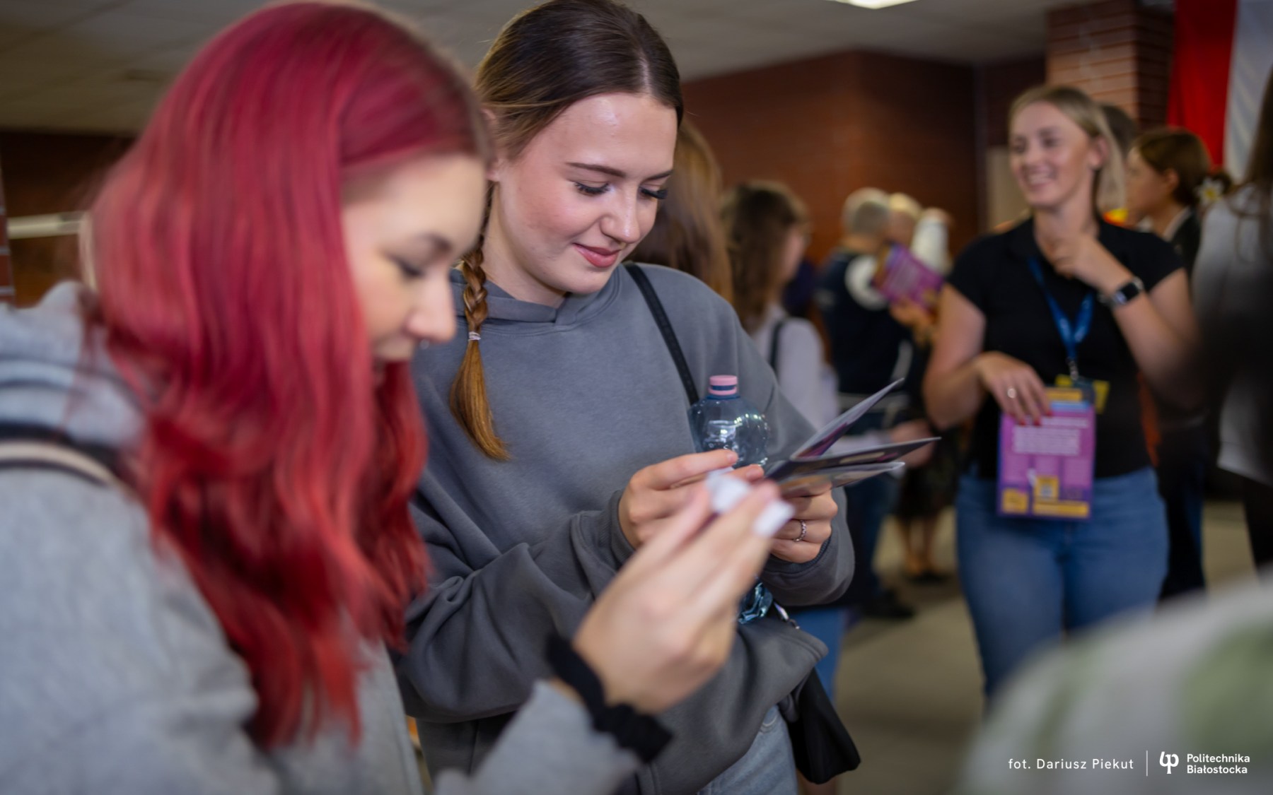 Dwie młode dziewczyny uśmiechnięte trzymają w dłoniach ulotki Politechniki Białostockiej Białostocki Salon Maturzystów Perspektywy 2024, fot. D. Piekut