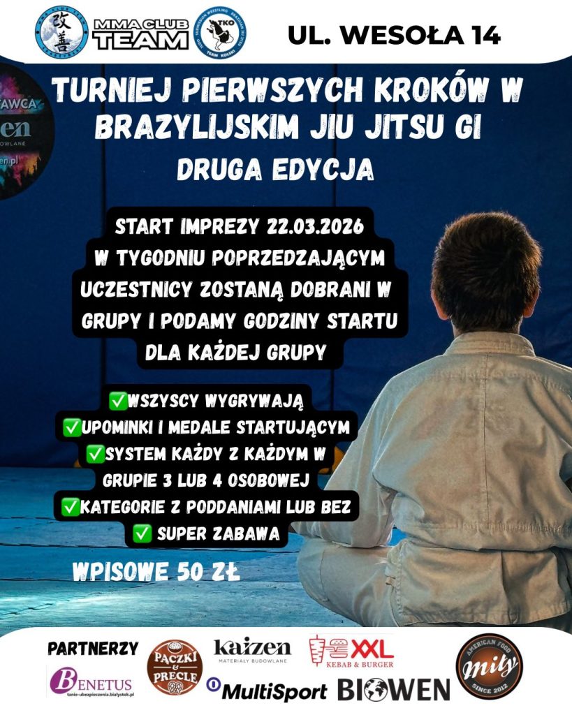 Już 22 marca 2026 w Białymstoku odbędzie się kolejna edycja Turnieju Pierwszych Kroków w Brazylijskim Jiu Jitsu GI. To inicjatywa organizowana przez MMA Club Białystok, skierowana do osób stawiających swoje pierwsze kroki w sportach chwytanych. O zawodach rozmawialiśmy z Łukaszem Skarżyńskim – organizatorem imprezy.