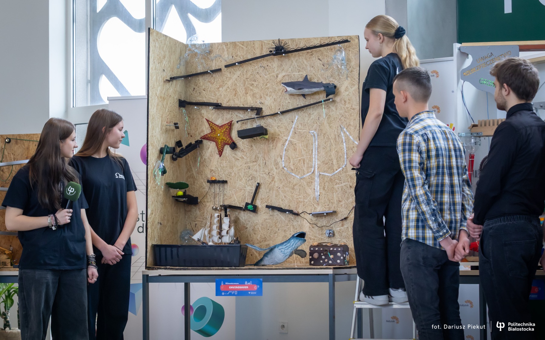 Jak działa Envirosaver? Wszystko zaczyna się od kulki pchniętej przez jeżówkę. Po drodze kulka pokonuje spiralę z miedzianych przewodów, rekina z kartonu po pizzy, rozgwiazdę, rolki po papierze, a także aktywuje kulki Newtona. Kulka wprawia w ruch cylinder 3D, most, a finalnie doprowadza do odpalenia świateł LED w kształcie godła Politechniki. Zwieńczeniem toru jest żaglowiec napędzany wiatraczkiem ze starego komputera – symbol ekologicznej podróży po „skarb”, czyli… skrzynię z indeksami!
