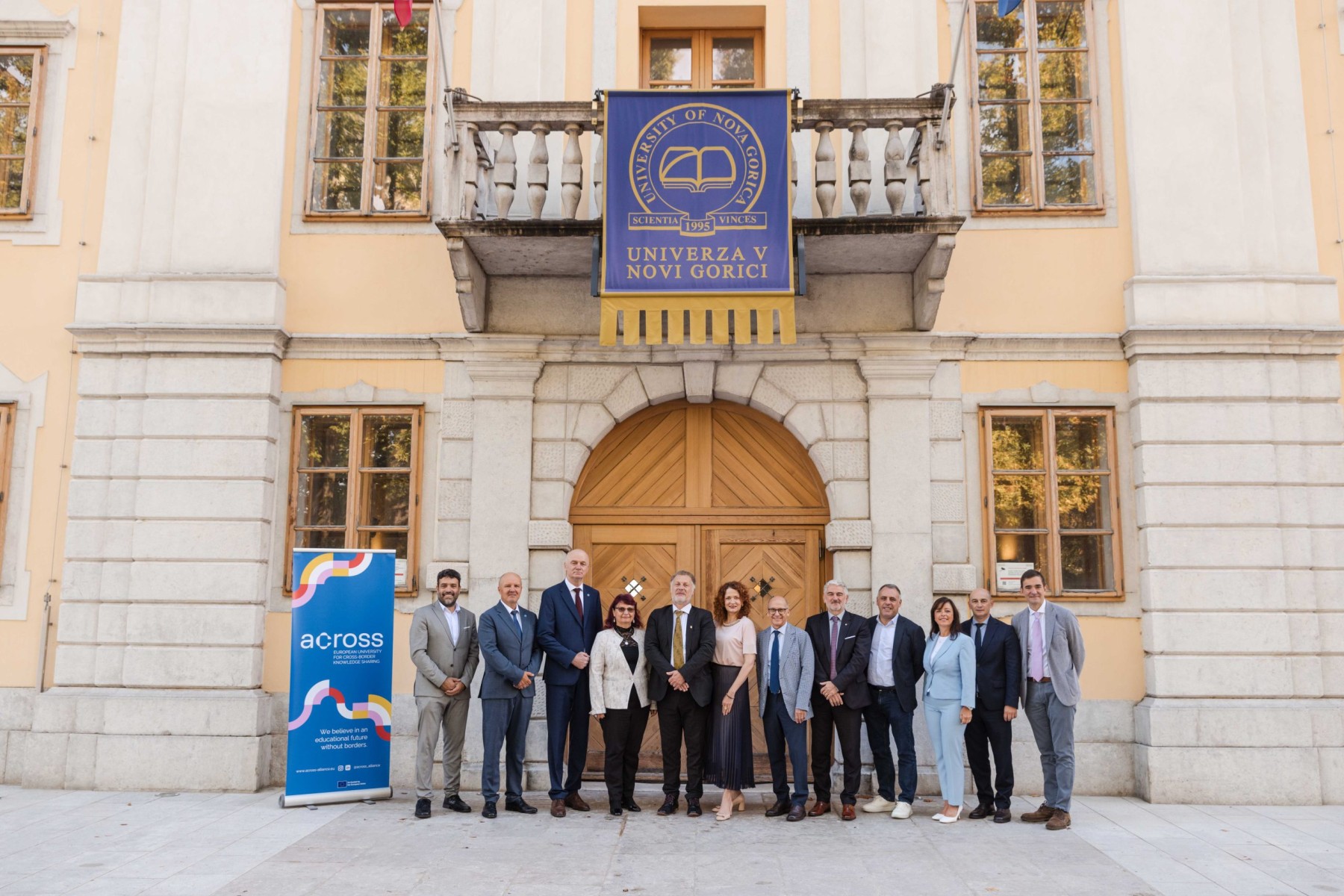Rektorzy dziewięciu uczelni partnerskich ACROSS przed Uniwersytetem w Novej Goricy, gdzie odbyło się posiedzenie Rady Rektorów i podpisanie Umowy Konsorcjum.
