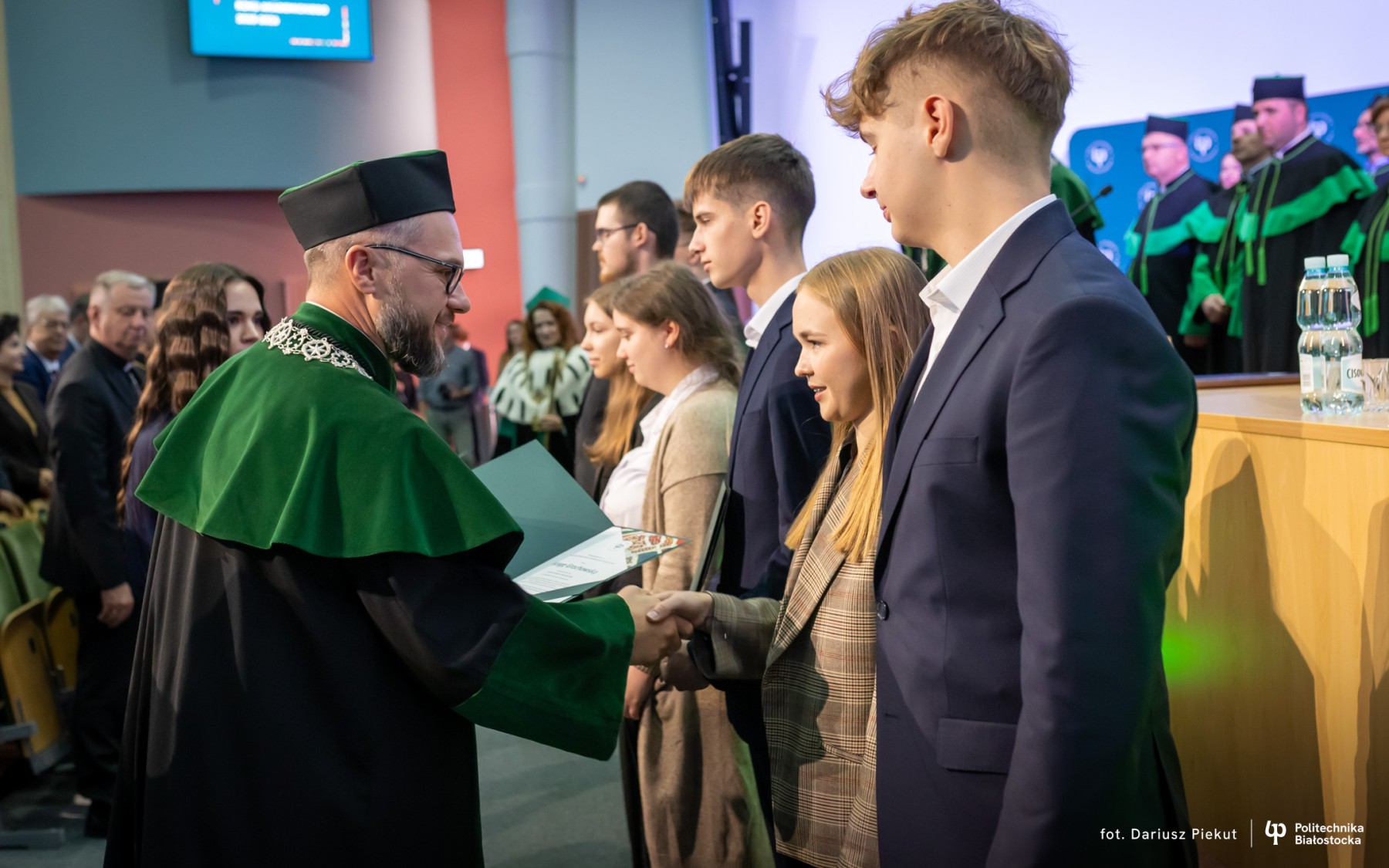 Ważnym punktem programu była immatrykulacja, czyli uroczyste przyjęcie nowych studentów w poczet społeczności akademickiej Politechniki Białostockiej. To szczególny moment dla pierwszorocznych, którzy oficjalnie rozpoczęli swoją ścieżkę edukacyjną na jednej z najważniejszych uczelni technicznych w Polsce.