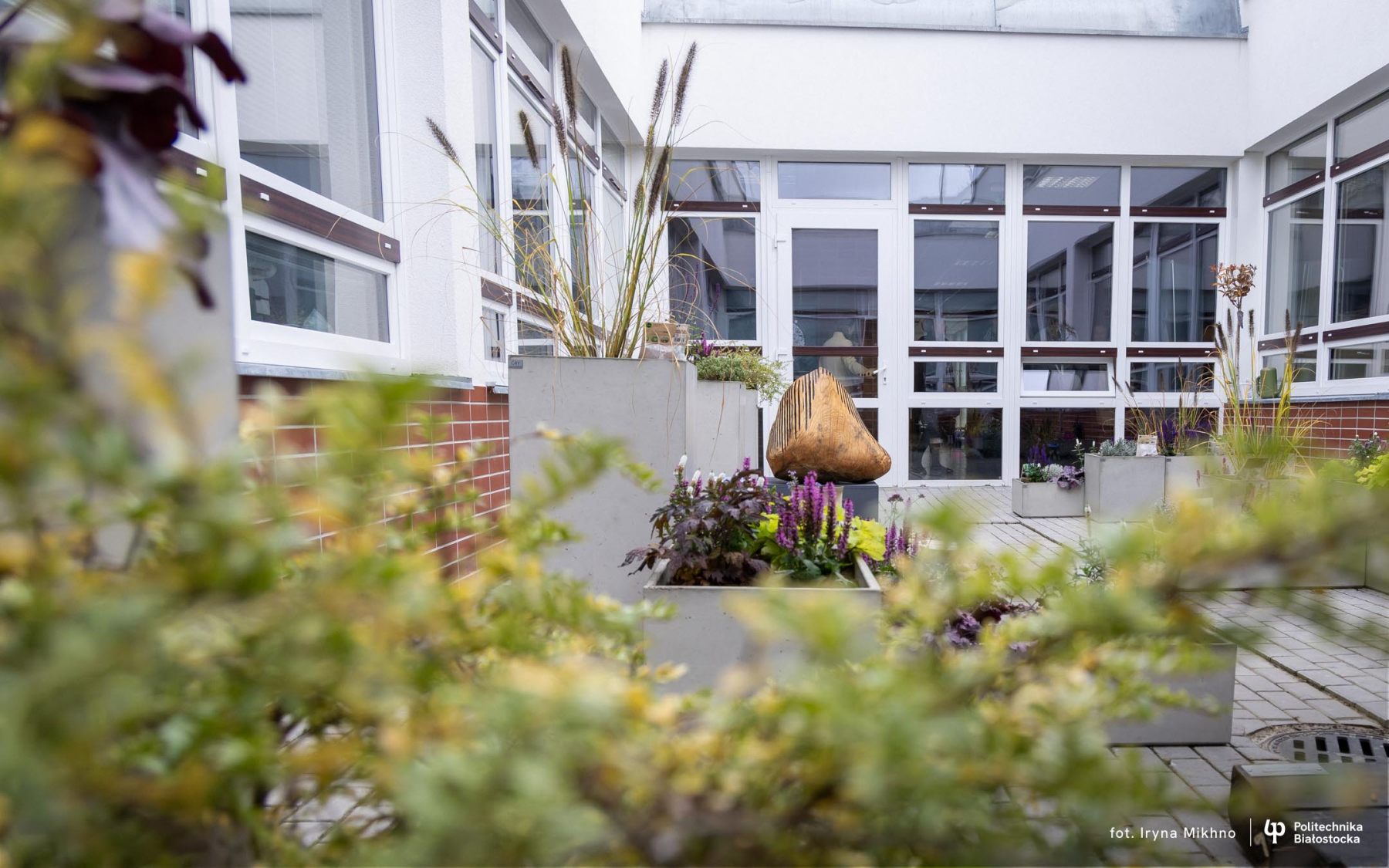 Kolorowy ogródek w sercu budynku, przyciąga swoją estetyką i spokojną atmosferą, idealną do odpoczynku i refleksji między zajęciami. Dzięki zielonej aranżacji atrium oferuje kontakt z naturą, nawet w środku gmachu uczelni, co pozytywnie wpływa na samopoczucie odwiedzających. Atrium wpisuje się również w strategię uczelni „Moja Zielona PB”