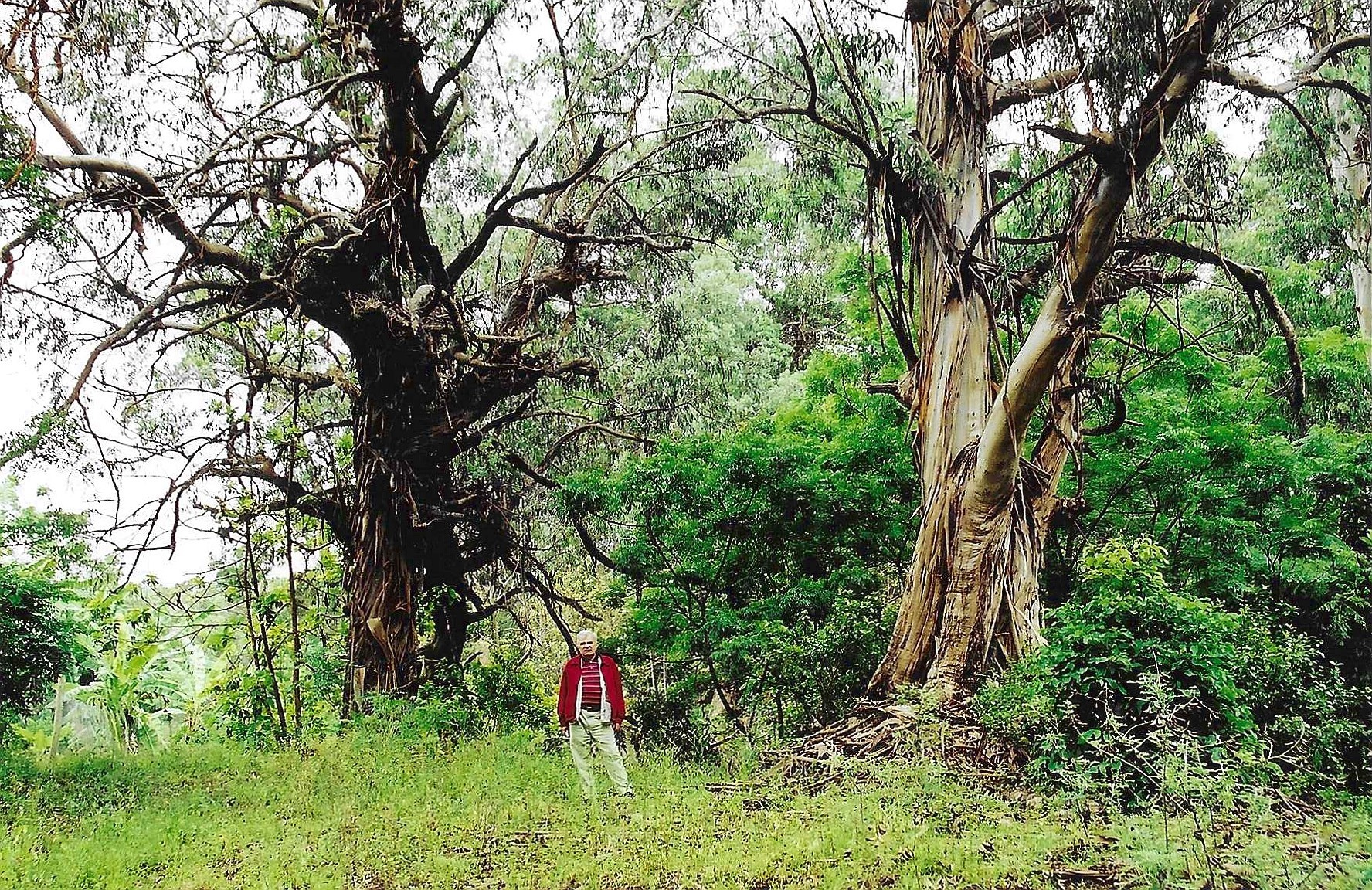 Choć kojarzona głównie z kamiennymi moai, Wyspa Wielkanocna zaskakuje także bujną, zieloną roślinnością. Lech Pilecki wśród eukaliptusów. Fot. archiwum prywatne.